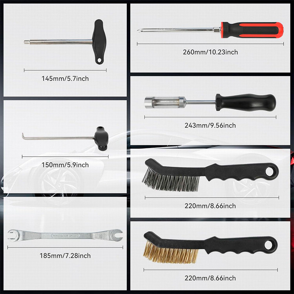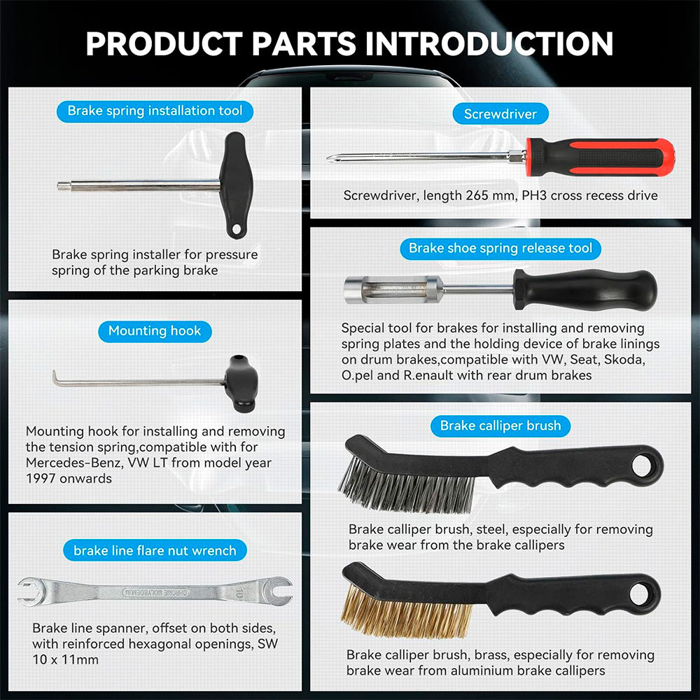 Zestaw umożliwia demontaż i obsługę zacisków oraz cylindrów hamulcowych, wymianę klocków, czyszczenie elementów układu i podstawowe prace serwisowe. Przeznaczony do użytku warsztatowego oraz prywatnego.