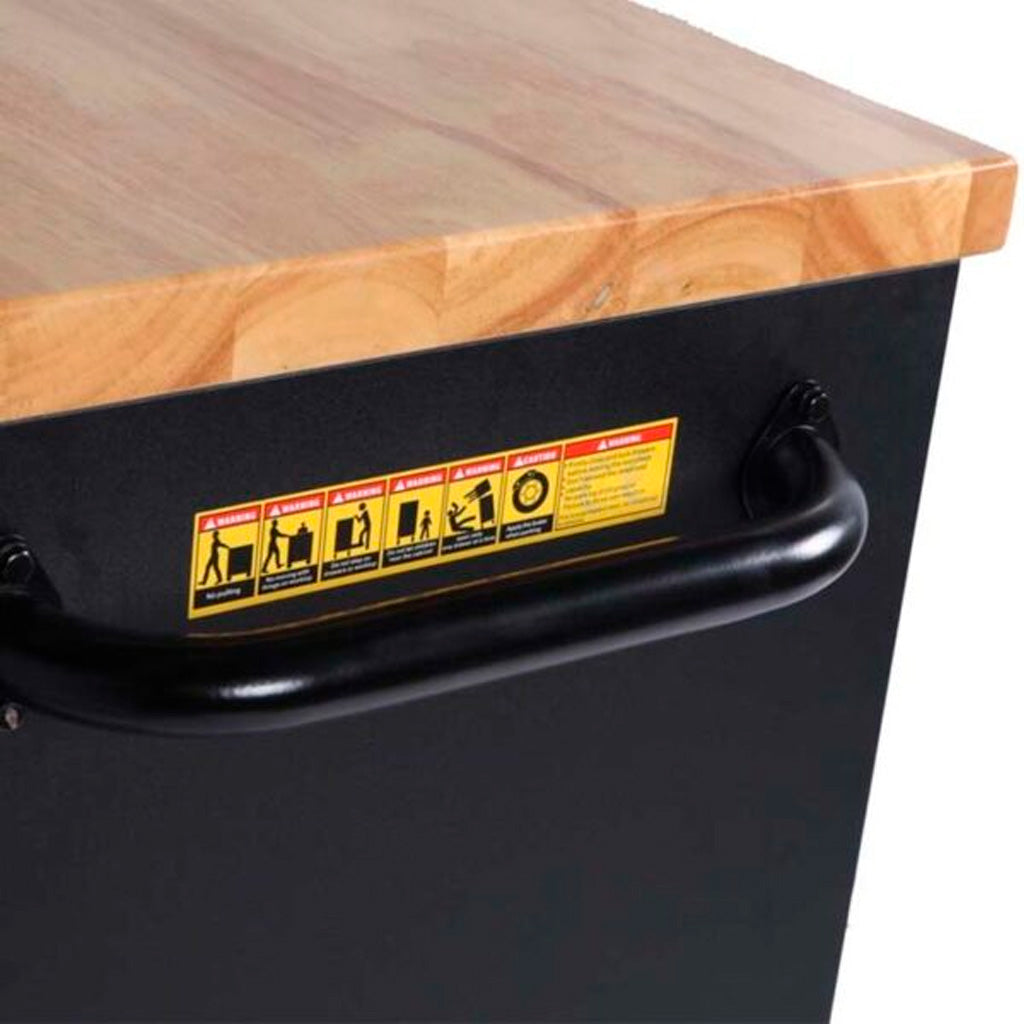 The trolley's body is made of durable, powder-coated steel in black with green accents. The 38mm-thick solid wood worktop provides a stable work surface. All drawers extend fully, allowing for quick access to tools. A central locking system secures contents, and two steel side handles facilitate maneuvering.