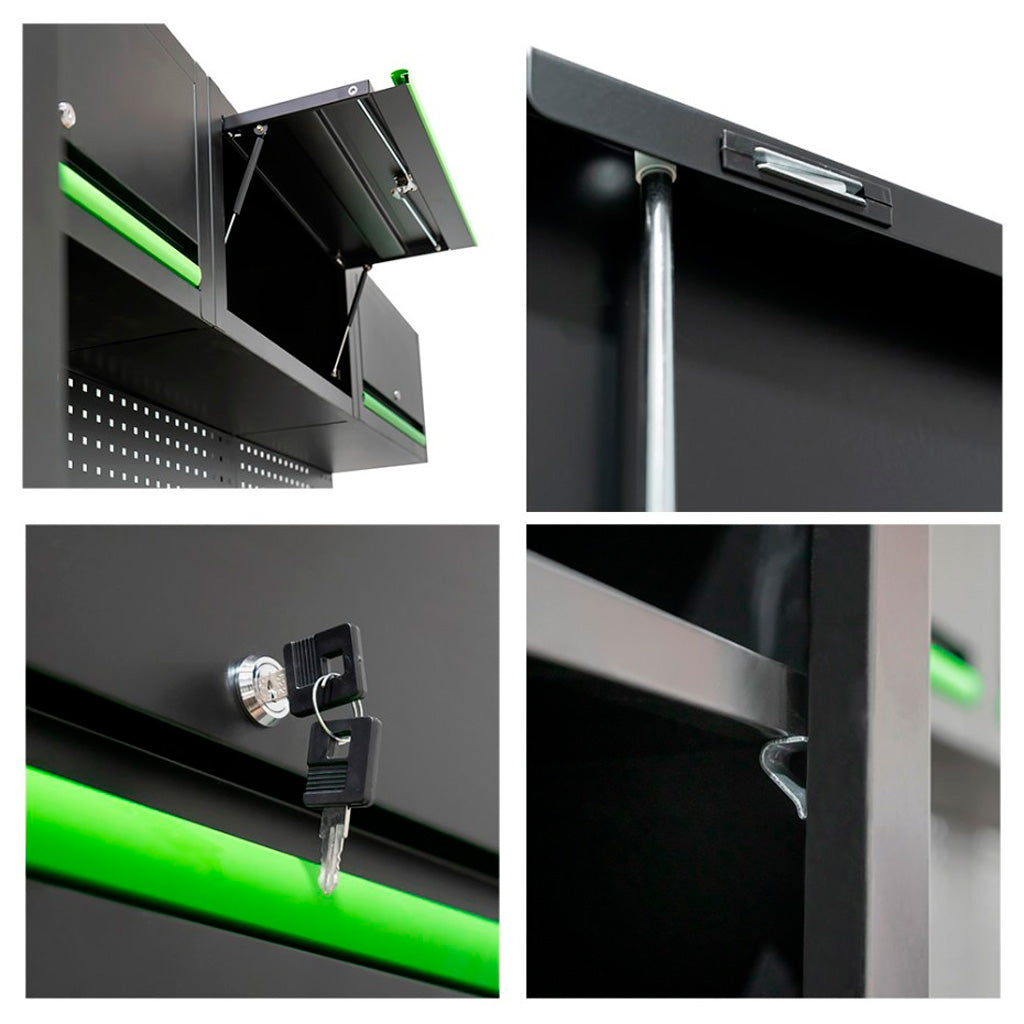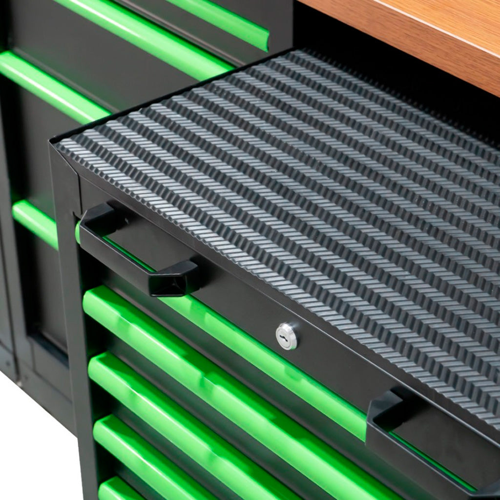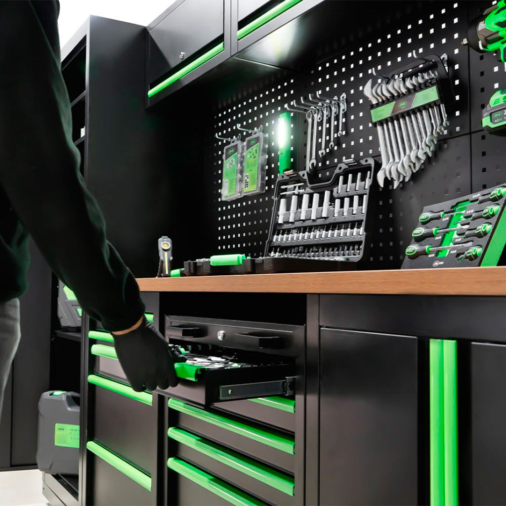 System SERIE446 został opracowany z myślą o ergonomii i funkcjonalności. Zestaw zawiera 18 elementów modułowych, w tym szafy, szafki ścienne, szafki z szufladami, perforowane tablice narzędziowe oraz solidny blat roboczy z płyty MDF. Dodatkowo wyposażony jest w 4 tacki EVA z wykończeniem imitującym włókno węglowe, przeznaczone do przechowywania narzędzi ręcznych.