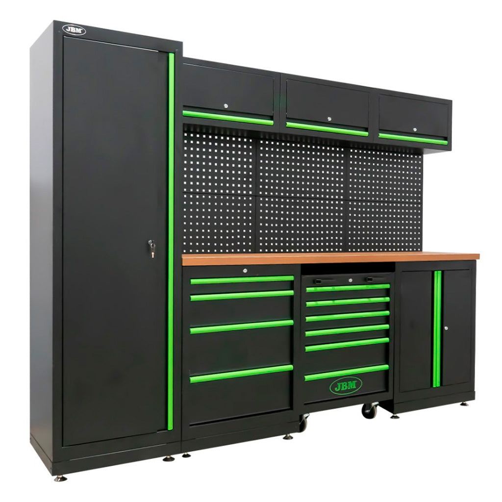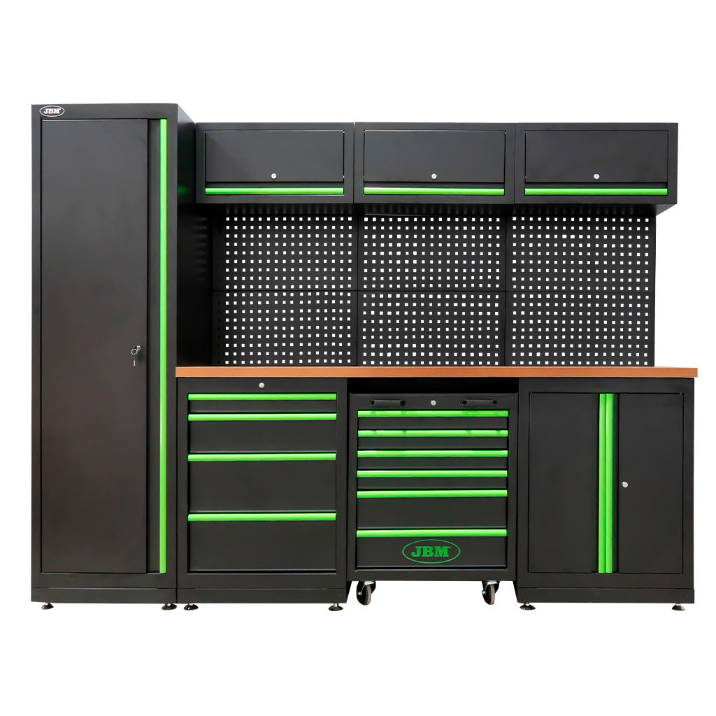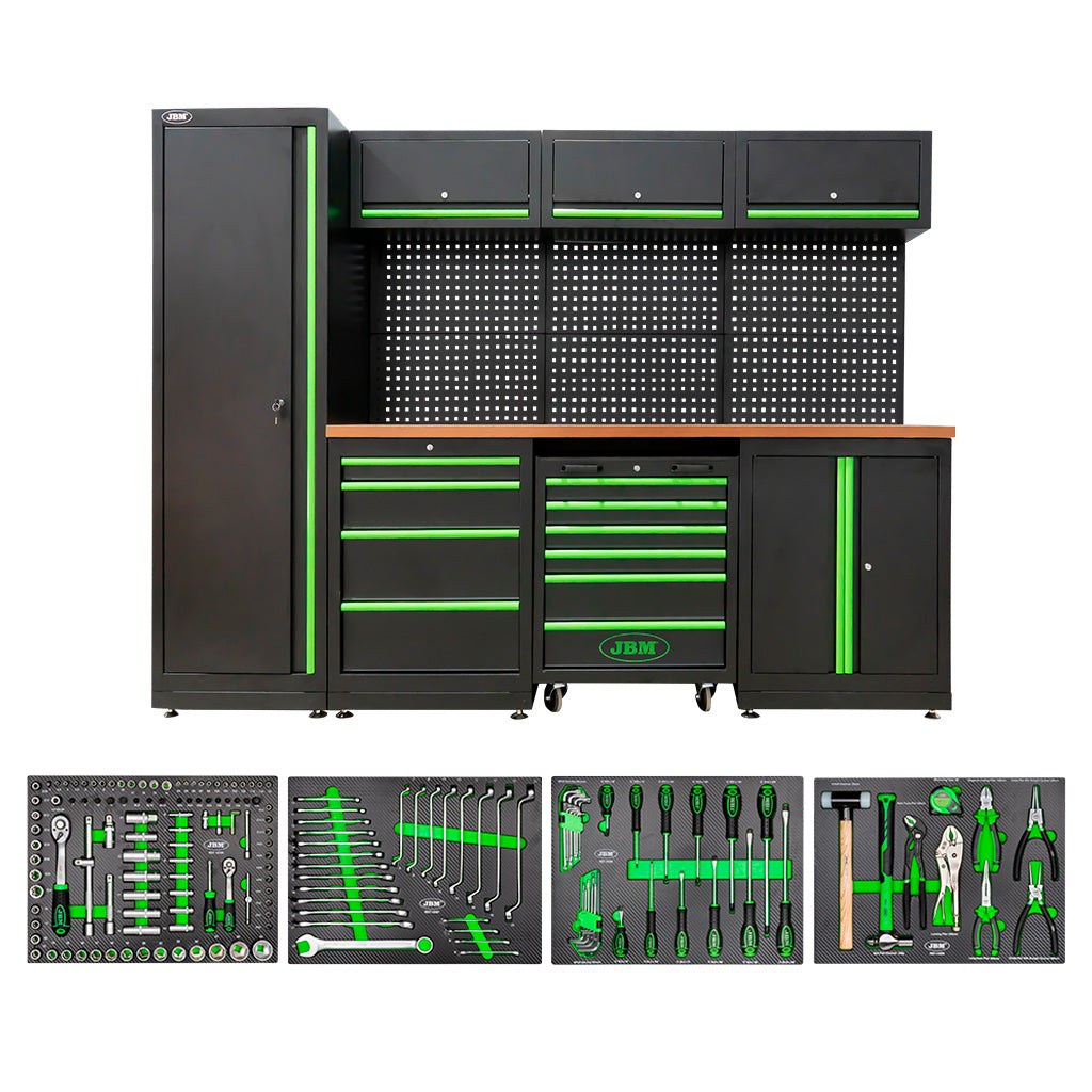 System SERIE446 został opracowany z myślą o ergonomii i funkcjonalności. Zestaw zawiera 18 elementów modułowych, w tym szafy, szafki ścienne, szafki z szufladami, perforowane tablice narzędziowe oraz solidny blat roboczy z płyty MDF. Dodatkowo wyposażony jest w 4 tacki EVA z wykończeniem imitującym włókno węglowe, przeznaczone do przechowywania narzędzi ręcznych.