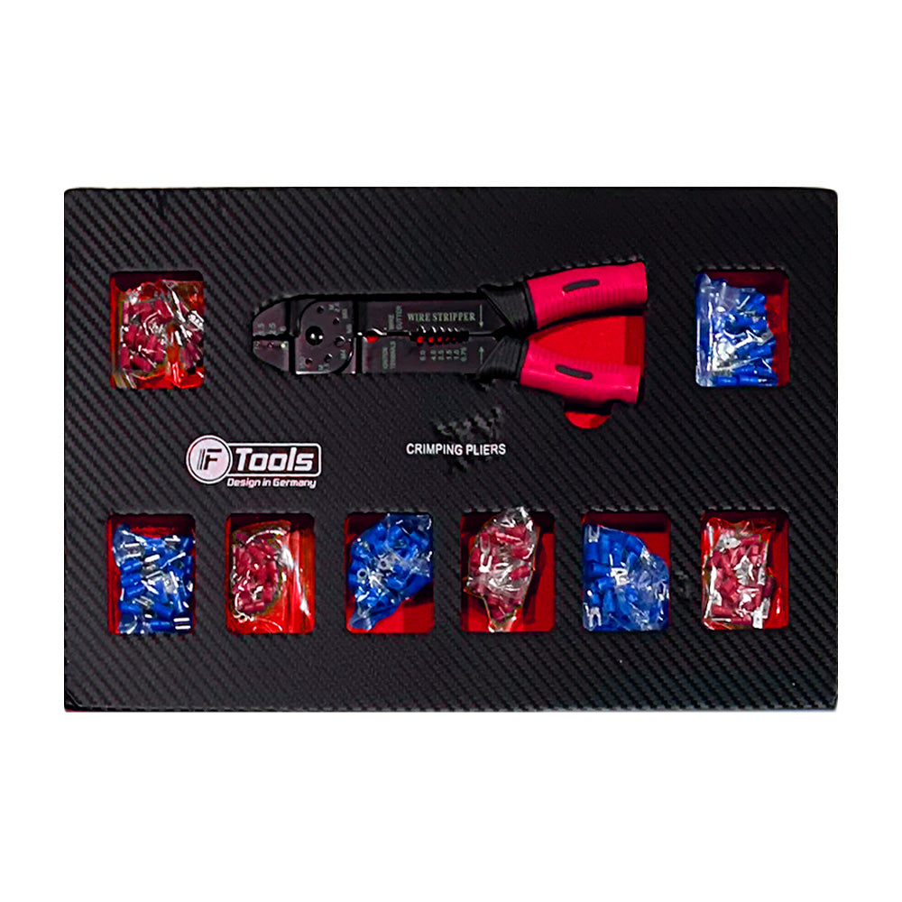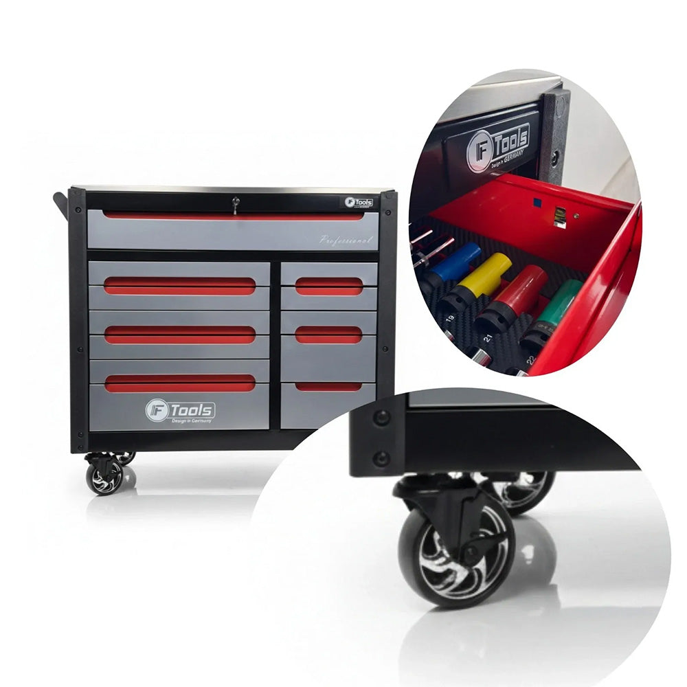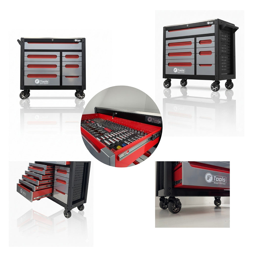 Wózek warsztatowy FTools 12/10 PRO, 473 elementów to mobilny wózek warsztatowy z 12 szufladami, z czego 10 wypełniono kompletnymi zestawami narzędzi. Wyposażony w powierzchnię ze stali nierdzewnej, odporną na korozję i uszkodzenia mechaniczne.